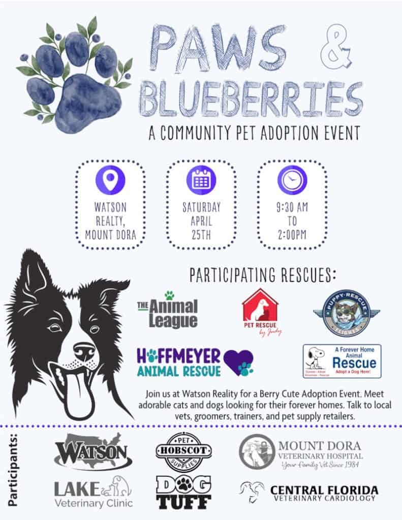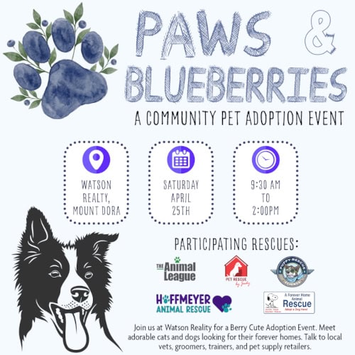 Join us at the Paws & Blueberries Pet Adoption Event on Saturday, April 25, 2026, from 9:30 a.m. to 2:00 p.m. at Watson Realty in Mount Dora.